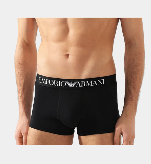 • Emporio Armani Mens Undergarments. Color: Black Emporio Armani Black Mens Knit Trunk. Centered Emporio Armani logo and metallic stripes on waistband; seaming on the back for added lift. Pouch: Contoured double-ply with center support dart; no fly. Fabric Content: Cotton 95% Elastane 5% .